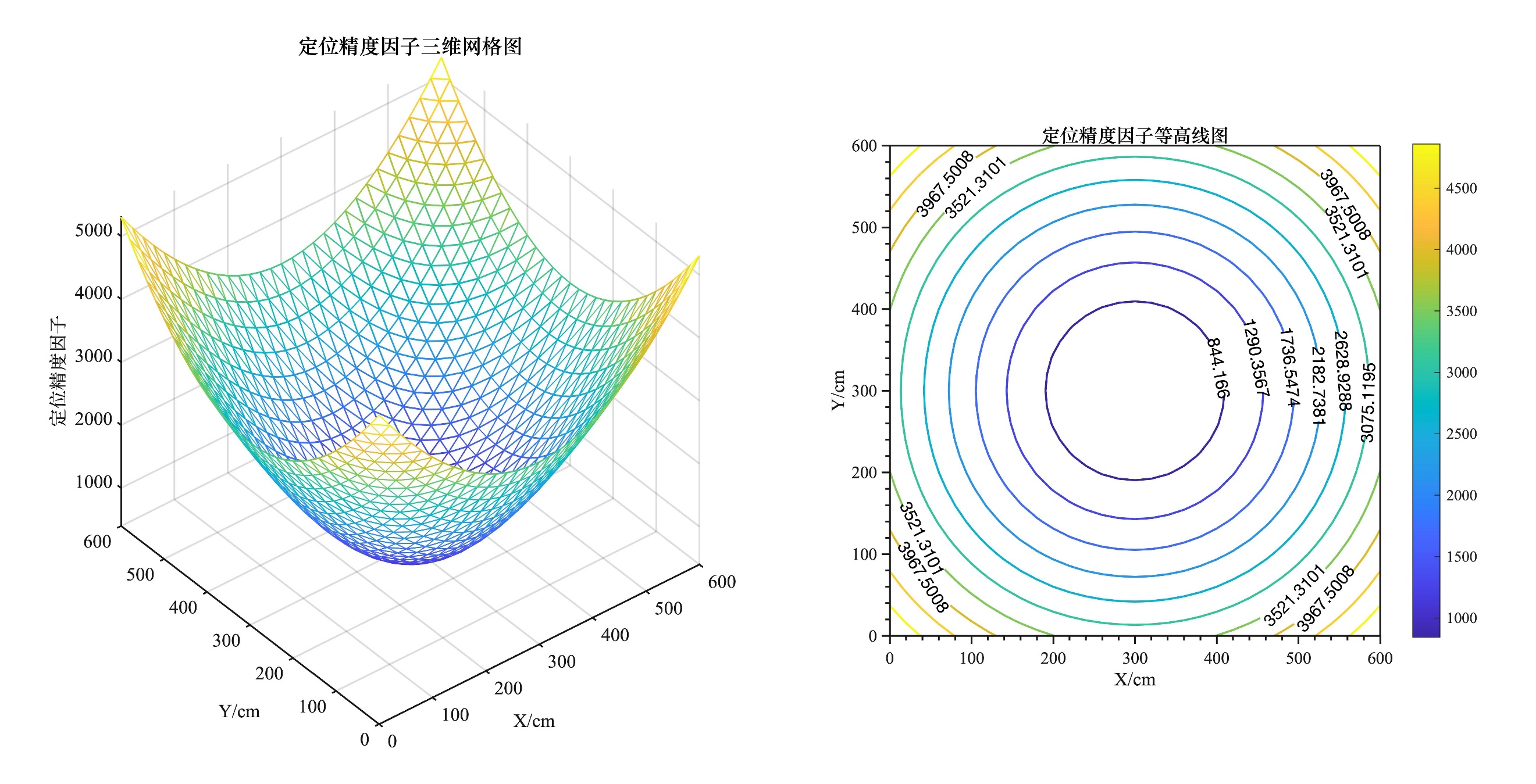 在精度评价模型求解出的四顶角定位系统的数据中,取高度为60cm的平截面绘制精度评价因子E的三维网格图与等高线图,如图2所示。该领域的大量实验数据表明,在基站矩形布局的情况下,定位误差从中心向外逐渐增大,与本文模型的模拟情况相契合。