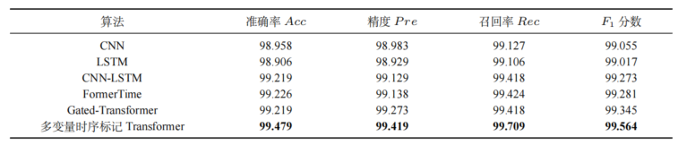 不同算法在四种不同评价指标上的对比结果呈现在表1中。从表1中可以看出 CNN和LSTM 的表现略差于 CNN-LSTM 的综合表现,这表明在 CNN 特征提取的基础上融合LSTM 时序依赖特征提取的效果更好。此外,两种用于处理多变量时间序列分类的 Transformer 变体方法 FormerTime 和Gated-Transformer 均呈现出优于上述三种方法的表现,表明 Transformer 相比传统深度学习方法(CNN和 LSTM 等)在长时依赖特征提取方面更具优势。更重要的观察是,所提方法的综合表现优于所有对比方法,表明所提方法中设计的多变量时序标记策略更适于处理在电潜泵故障诊断任务。