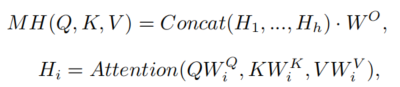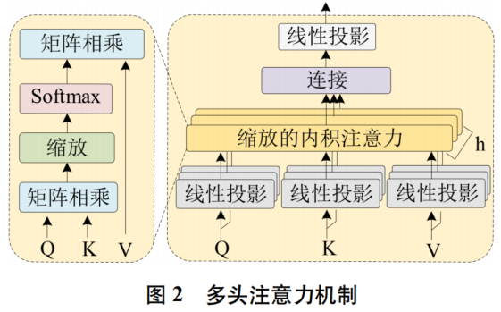 图2给出了多头注意力机制的细节,将对每个不同的注意力头进行组合,并采用线性映射来得到多头注意力值,公式化表示为: