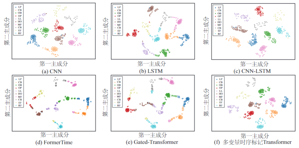 为更细致地分析不同方法的电潜泵故障诊断表现,在图3中绘制了不同方法的混淆矩阵。其中,行表示样本故障类别的预测值,列表示样本故障类别的真实值。从图中可以看出大多数诊断失败的情况发生在管柱漏失 LP、产液低 LL 和电气故障EF等几种故障,表明这三种故障模式相对比较复杂,是较难诊断的故障。多变量时序标记 Transformer 神经网络与其他方法相比在其余故障上的诊断表现更优。此外,考虑到不同方法提取到的数据特征的分布是评估模型泛化表现的重要指标,将不同方法提取到的特征进行了可视化。具体地,采用 t 分布随机近邻嵌入(t-distributed Stochastic Neighbor Embedding, t-SNE)方法对特征进行降维,并绘制在图4中。从图中可以看出,相比其他方法,多变量时序标记Transformer 神经网络展现了更优的类内紧凑性和类间可分性,进一步验证了所提方法的优秀特征提取能力和泛化表现。