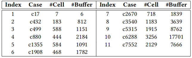 表1展示了用于评估所提出的AQFP逻辑电路布局算法的测试例的详细信息,包括每个电路的名称(如c17、c432等)、单元数量(从7个到7552个不等)以及所需缓冲器数量(从7个到3256个不等)。这些数据反映了测试例在电路规模和缓冲器需求上的多样性,为验证算法在不同规模和复杂度下的有效性提供了全面的基准。