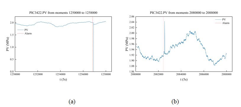 PIC3422.PV工艺参数诊断结果如图4所示。在图4(a)中,工艺参数在1256832时刻发生大幅度异常趋势报警;在图4(b)中,工艺参数在2082432时刻发生短时非平稳异常趋势报警。工艺参数PIC3422.PV的数据在2.0范围变化,在图4(a)中工艺参数从稳定值附近迅速下落至0,属于大幅度异常趋势;而在图4(b)中工艺参数在2.0附近小幅变化,但相对于邻近时刻的数据来说,存在不平稳的数据波动变化,属于短时非平稳异常趋势。