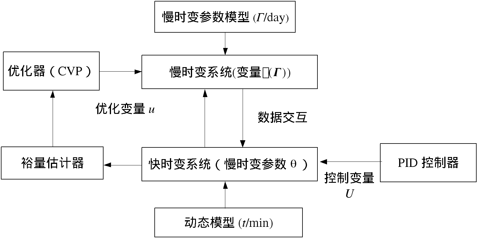 快时变系统接收优化后的操作变量u,并通过控制器保持反应器的稳定运行。相应地,当控制器在稳态下运行快时变系统时,控制器将所表示的稳态变量上传到慢时变系统中。此外,涉及到裕量部分时,快时变系统的状态变量通过在线的裕量估计器,估计出相应的控制裕量和工艺裕量,再由优化器得到保证一定操作裕量的最优的优化变量。总体结构如图1所示。