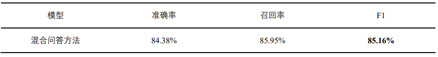 本文方法在全球含油气盆地领域的问答准确率达到84.38%,召回率达到85.95%,与单一的知识图谱问答和文档问答效果相比均有较大程度的提升,由此验证了混合问答方法的有效性。