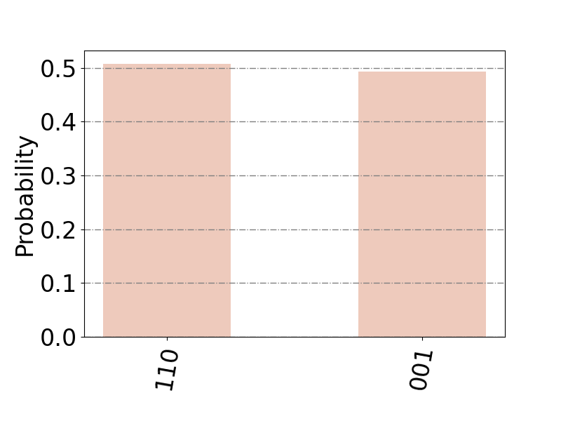 模拟结果如图3所示,横坐标表示量子态,对应到无向图的顶点集合,纵坐标表示该量子态被测量得到的概率。算法执行完毕后,以高概率获得两个极小支配集。通过Grover量子搜索算法获取所有的极小支配集后,利用经典算法在这些集合中进行最小支配集的搜索,最终发现{A}是最小的支配集。