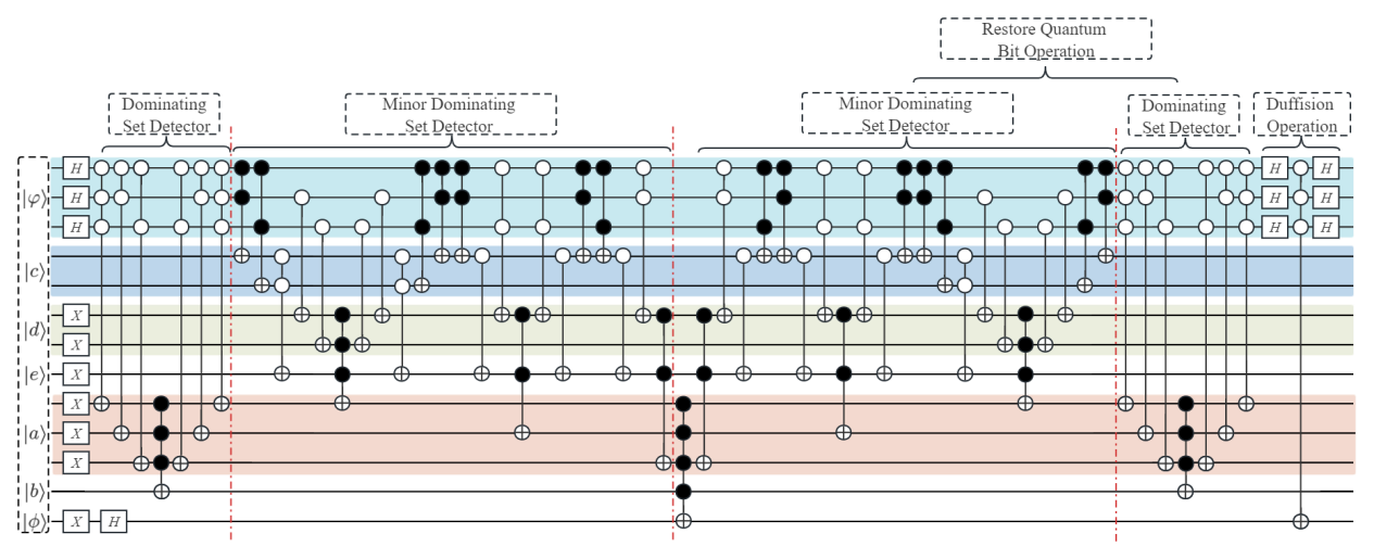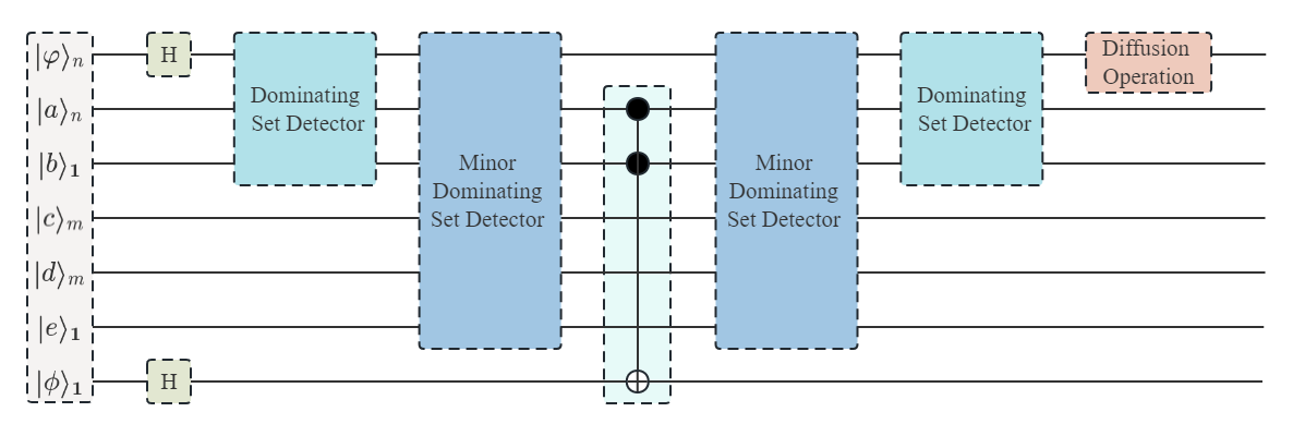 通过对支配集的性质进行分析,我们将量子比特按照不同的功能分为了7类,并将算法分为支配集探测和极小支配集探测两个部分,设计了如图1所示的量子线路总体框架。