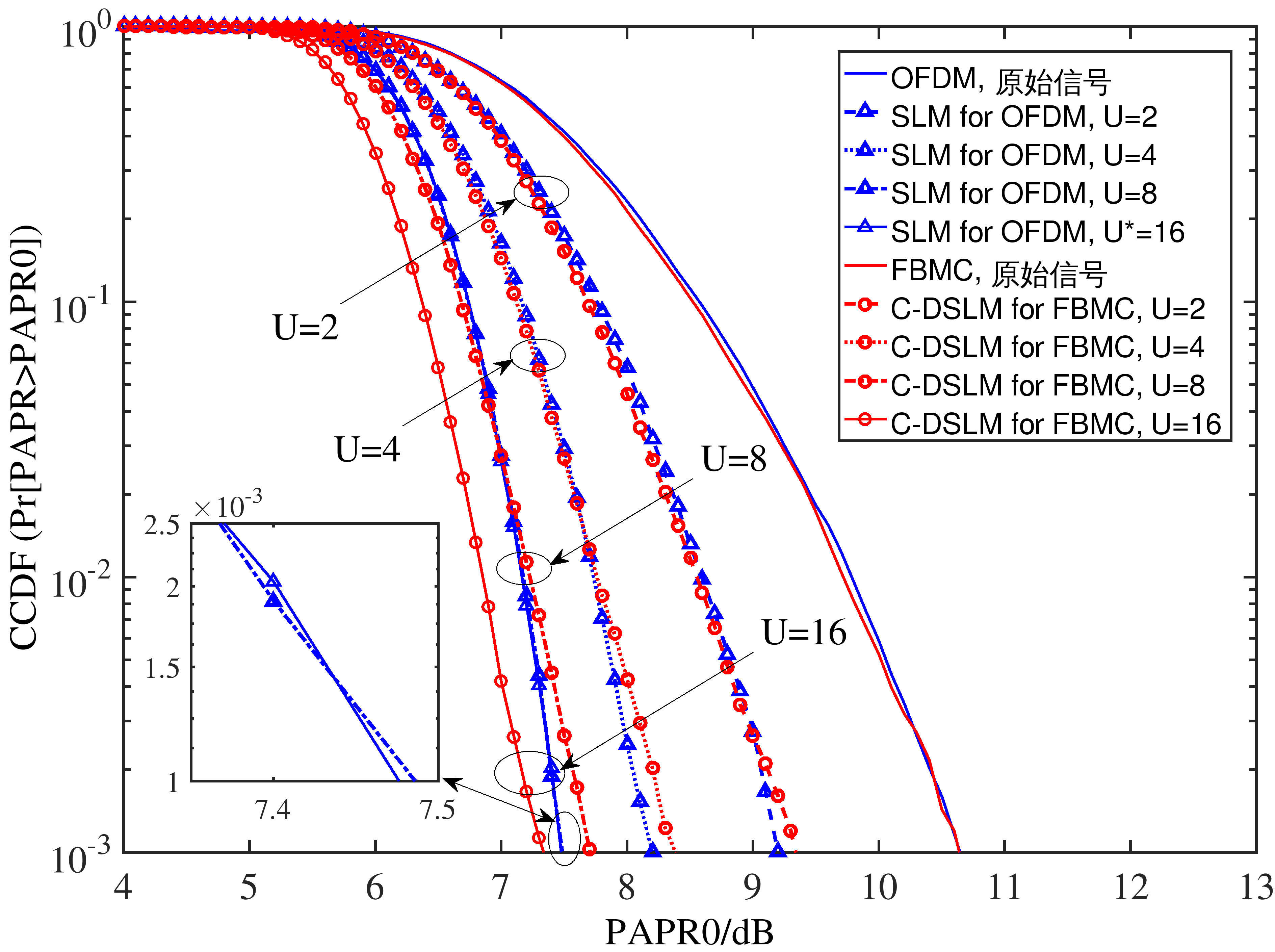 比较FBMC系统中C-DSLM方案与OFDM系统中SLM方案的PAPR抑制性能,观察图3中曲线可以发现,与SLM方案在OFDM系统中的PAPR抑制性能相比,C-DSLM方案在FBMC系统中能够取得相近的性能。在Pr(PAPR>PAPR0)=10-3情况下,当U=8时,它们之间仅有0.22 dB的差距,而当U=4时这个差距缩减到0.18 dB。与U=8时相比,SLM方案在U*=16时(其中8个相位旋转向量通过翻转另外8个相位旋转向量的正负号得到)没有取得任何的PAPR抑制性能增益,而C-DSLM方案获得了多达0.37 dB的性能增益。