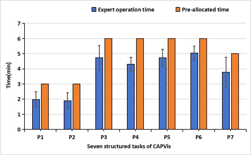 为评估系统的有效性,邀请四位专家进行了结构化实验和访谈,请他们在限定时间内完成任务P1-P7,之后汇总并统计了专家完成任务所用时间,并通过系统可用性量表(SUS)定量评估系统的可用性。图8显示了预设任务时间与实际操作时间的比较。蓝色框表示专家完成任务的平均时间,结果显示实际操作时间短于预设时间,表明专家迅速熟悉了系统。任务P7(快速识别多工况相似性)的操作时间差异较大,表明不同用户在学习该复杂任务时存在差异。SUS问卷量表的评估结果如表1所示,系统的平均得分为82.52,显著高于SUS平均得分(68)的阈值,表明系统的可用性良好。