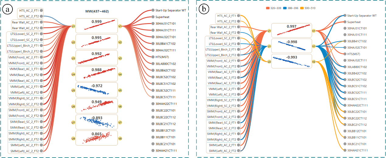 单一工况下,专家希望探索壁温参数集与受影响参数集的关联。如图6所示,通过观察散点图和条形图,发现水冷壁区域的温度参数波动较大且高度相关。接着,利用CCA视图专家评估壁温参数与受影响参数之间的典型相关模式,从冗余性、稳定性和贡献度等方面进行了分析。结果显示,前三对典型变量包含了大部分信息,主要影响过热度、启动分离器壁温和高温过热器出口主蒸汽压力。专家指出,这符合温度传递路径,并表示未来可据此调整局部壁温,优化受影响参数状态。