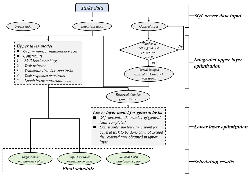 石油和天然气行业在满足世界能源需求、推动经济发展和推动各个行业发展方面发挥着关键作用。油气田的作业涉及一系列复杂的活动,目的是定位、提取和提炼碳氢化合物。油气田的作业很复杂,需要昂贵的设备和设施。为了确保生产效率,这些设备和设施的正常运行至关重要。在生产过程中,会出现多种复杂的任务,优先级多,故障分布广,即维修任务。维修任务包括例行检查、设备维修和预防措施,以避免代价高昂的停机时间。如果不能及时有效地处理异常,就会导致故障。这会降低经济效益,甚至造成重大安全事故。及时高效的维修任务调度不仅可以节省维修成本和时间,还可以提高生产效率,对现场作业具有重要意义。