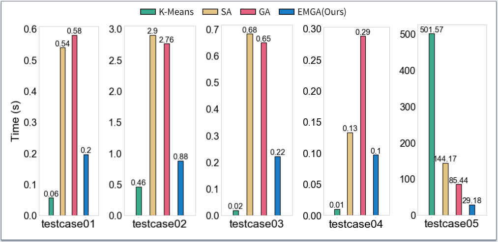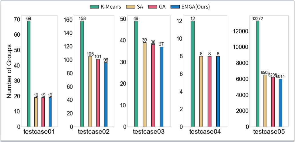如上图实验结果所示,与其他方法比较,EMGA在最为关注的分组质量方面表现最好。EMGA结合了贪心算法和遗传算法的优势。它能快速得到一个初始解,并且能够通过改进的遗传算法维护一个多解集合,其中包含了搜索到的多个优秀解。这些解之间可能存在一定的差异,提供了更多的选择余地。这使得我们的算法比朴素的遗传算法具有更好的性能。相比之下,模拟退火算法和K-Means算法更容易受局部搜索的限制,可能陷入局部最优解。模拟退火算法相对较容易陷入某个解附近,导致生成更多且相似的分组。K-Means算法本身倾向于找到局部最优解而不是全局最优解。