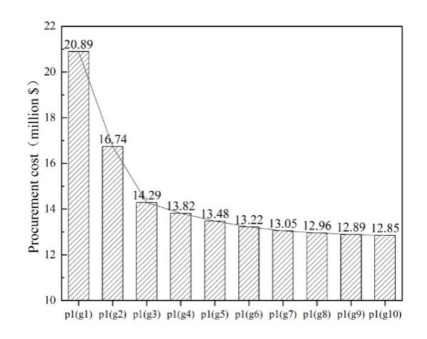 虽然较小的设定值 g 能够使实际过程中调和原油的性质更加稳定,但仅关注调和原油性质的稳定性是不够的;模型还需要考虑原油采购的成本。当设定差距值 g = 15% 时,案例1-4的原油采购成本如图5所示。