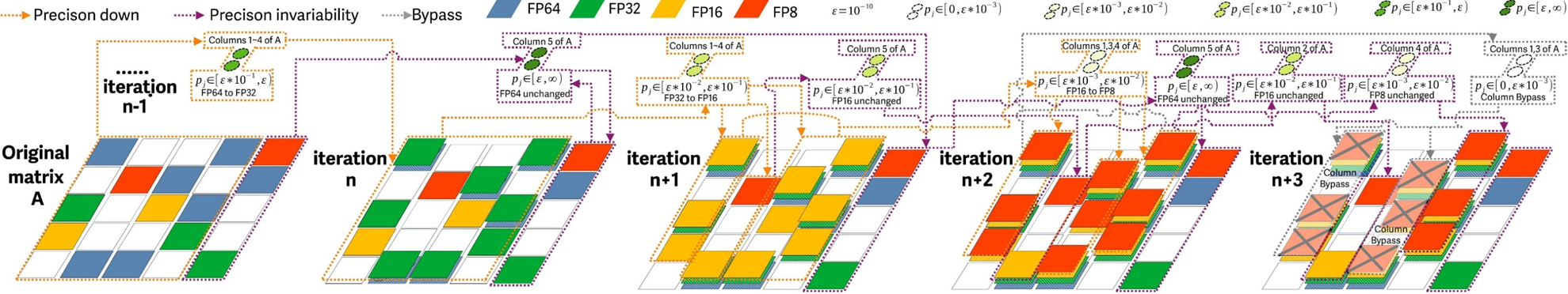 最后,为了在迭代过程中利用解向量x 中已经收敛的元素来优化SpMV的性能,我们根据收敛阈值ε设定了四个范围并实现了一种部分收敛感知混合精度策略,运行时在单个内核内实现块粒度的片上动态精度转换。我们的精度转换仅在共享内存中进行一次,减少了访问全局内存或执行精度转换的高昂开销。