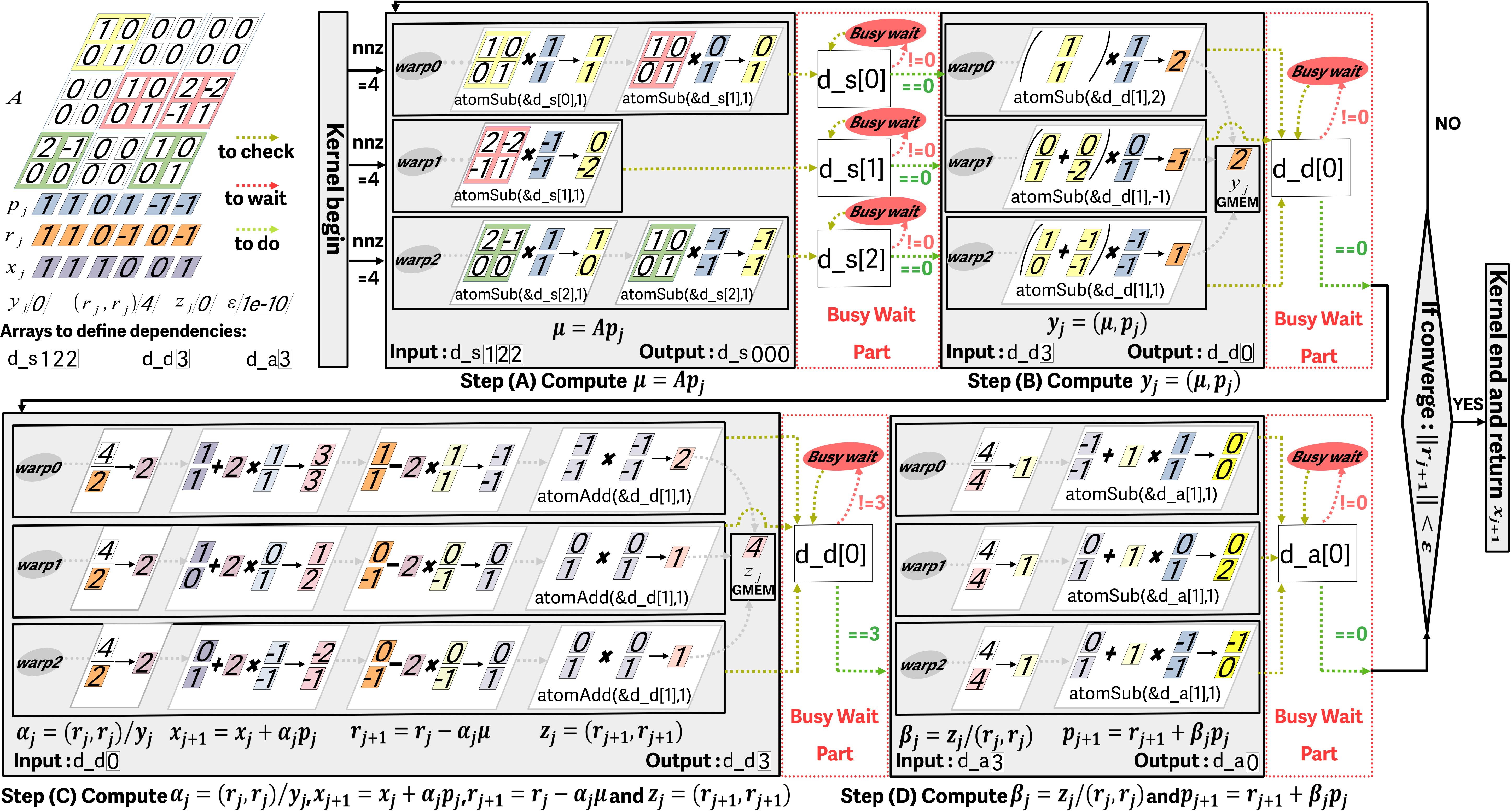 接下来,为了减少GPU上不同内核之间的同步开销,我们利用原子操作使整个迭代法求解过程在单个GPU内核内运行。为了实现同步,我们构建多个依赖数组来定义数据和操作之间的依赖关系,并允许原子操作调度warp以执行不同操作的任务。我们根据依赖关系将CG算法分为四个部分,内核启动之前,矩阵A的非空块以负载均衡的方式分配给每个warp并且被加载到共享内存中一次,并在迭代过程中被重复利用,这样可以提升程序的访存效率。