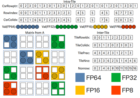 我们设计了一种细粒度的两级分块稀疏矩阵存储格式,高级存储以COO的结构捕获块间的信息用于确保SpMV计算过程的负载均衡,并且根据稀疏矩阵中非零元素初始值的范围使用四种不同精度进行存储,对于低级存储,我们使用 CSR 方式来记录块内信息,使用额外的数组记录块内非空行的信息,用于避免在 SpMV 操作期间遍历块中的空行,从而进一步提高 SpMV的性能。