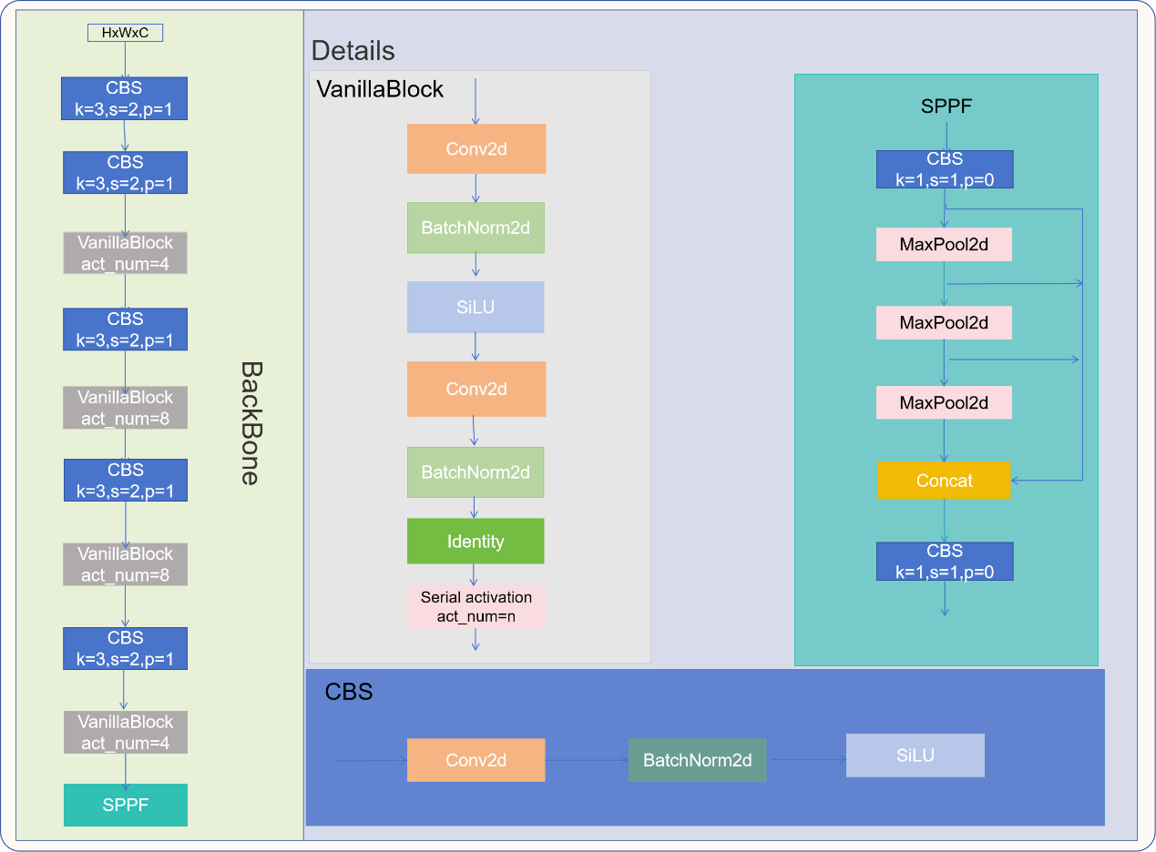 为了提升YOLOv8在GPU上的检测速度,我们在VanillaBlock的基础之上,搭建了一种新的骨干网络Yolov8_VanillaBlock,其整体结构图如图2所示。