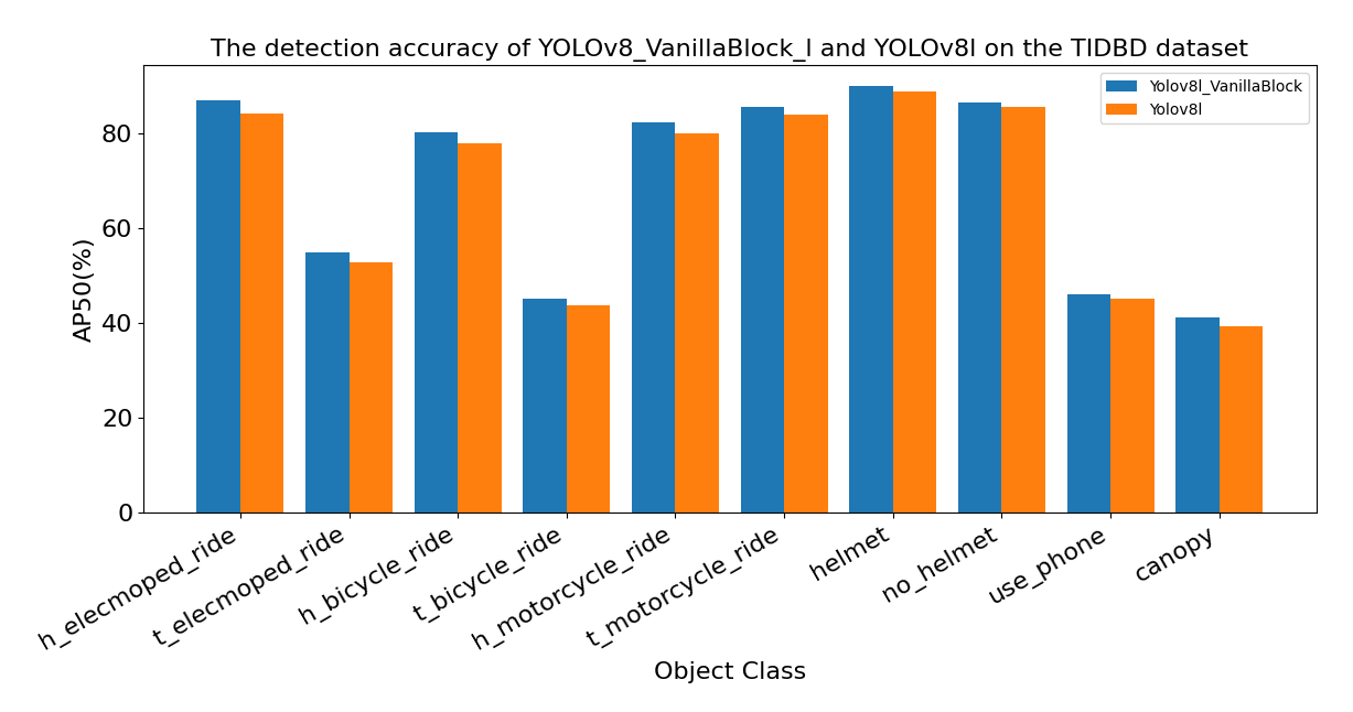我们在TIDBD数据集上使用较大尺寸的YOLOv8l和YOLOv8_VanillaBlock_l模型进行实验,以平衡检测精度和模型大小。以平均精度(AP50)为评价标准对两种模型进行比较。实验结果表明(图3所示),我们提出的YOLOv8_VanillaBlock_l在“use phone”、“canopy”等检测类别上显著优于原始的YOLOv8l。