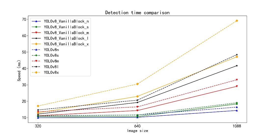 图4 不同尺寸的YOLOv8_VanillaBlock与YOLOv8在不同大小的图片上检测时间的对比
