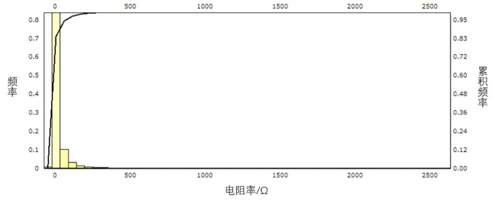本文将设计好的电阻率空白带填充模型直接应用于真实电阻率数据,填充效果不佳。首先对电阻率数据进行分析,发现电阻率数据分布集中,同时存在极少数离群值,分析结果如图8所示。