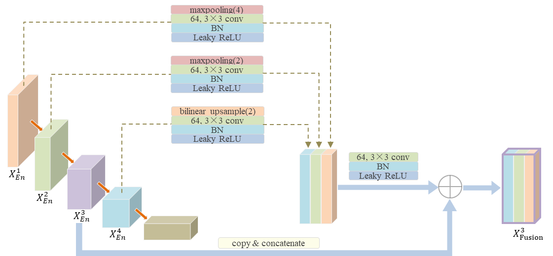 同时,在编解码特征连接环节引入多层级编码特征融合模块与信息引导模块,丰富上采样的特征尺度,减少解码过程中的信息丢失,具体细节如图6和图7所示。