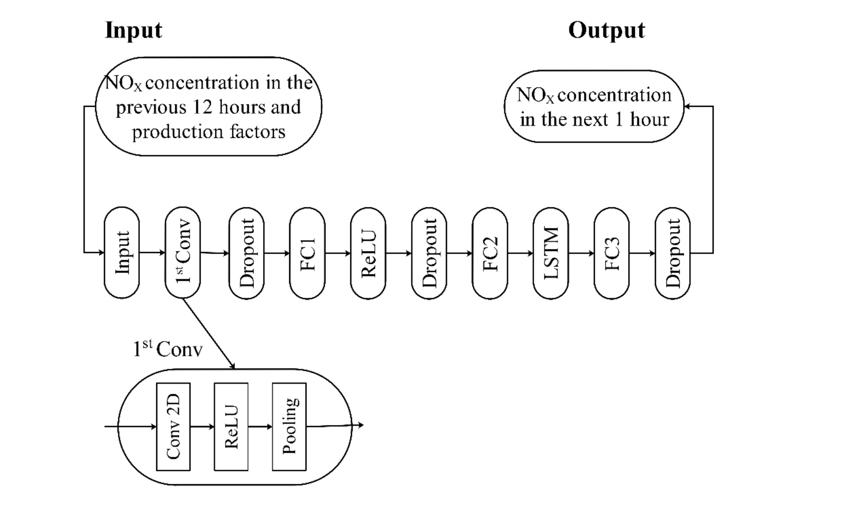 在本文中,基于中国石油某350 万吨重油催化裂化装置的生产运行和污染排放数据,提出了一种结合CNN和LSTM的深度学习网络结构,对提出的网络进行超参数调试,并与单独使用CNN与LSTM进行污染外排预测的效果与性能进行了对比。算法结构如下: