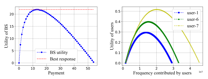 从图2可以看出,基站和用户存在唯一的Stackelberg均衡策略。为了验证唯一Stackelberg均衡的存在性,在用户数量和用户策略固定的情况下,将支付从0变化到50。基站的效用曲线呈凸形,曲线最高点为Stackelberg均衡的最佳响应。本文还验证了用户间的唯一纳什均衡,对于每个用户根据其他用户和基站支付的固定策略改变频率。值得注意的是,每个用户的效用曲线都是凸的。在这种情况下,用户可以通过确定计算资源的策略来最大化效用。