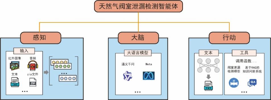系统接收阀室环境采集的音频和红外热成像图片数据,利用通用大模型调度天然气阀室泄漏行业模型和基于增强检索生成(RAG)技术的知识问答工具,自动完成泄漏检测流程,根据识别结果智能生成相应的泄漏处置方案。如图1所示: