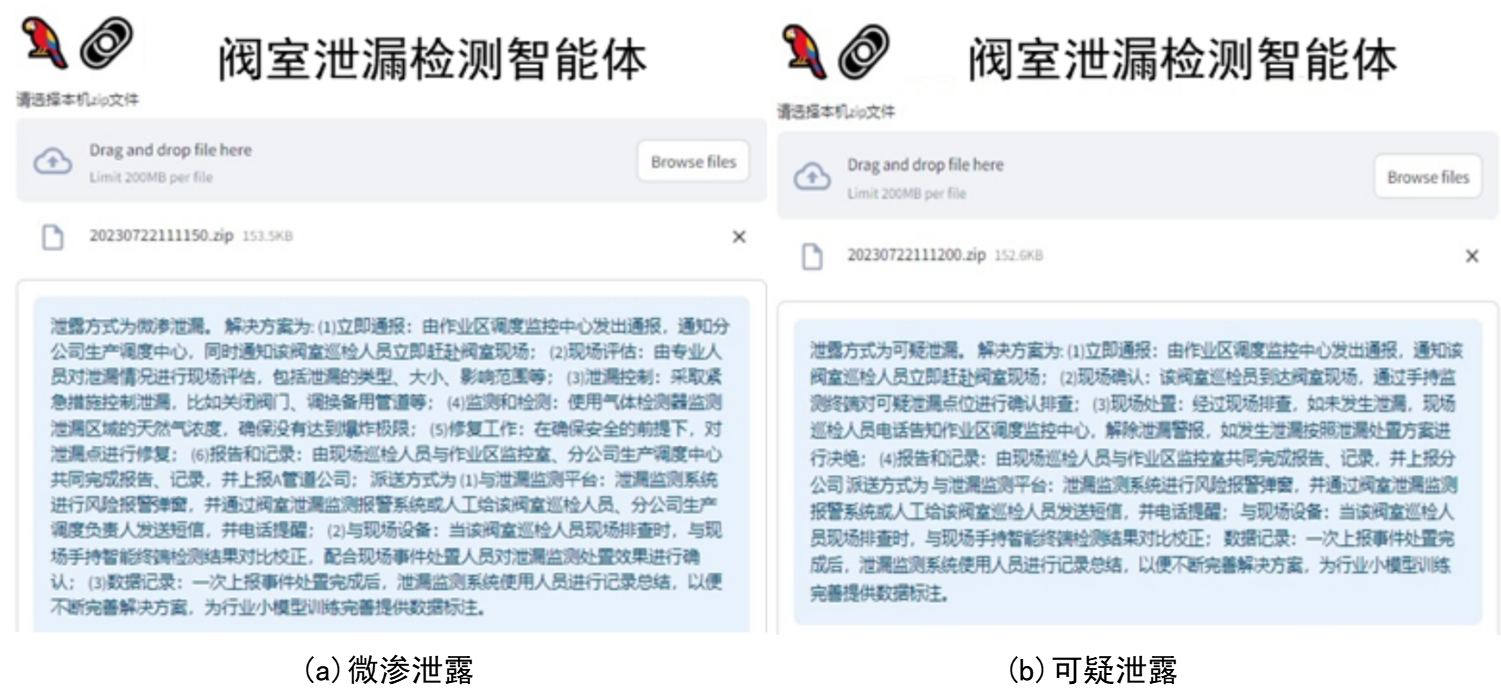 其中,输入一个包含音频和图像的压缩文件,智能体调用音频和红外测温综合模型诊断是否发生泄漏、泄漏等级,同时给出相应的解决方案和任务派送。如图5所示: