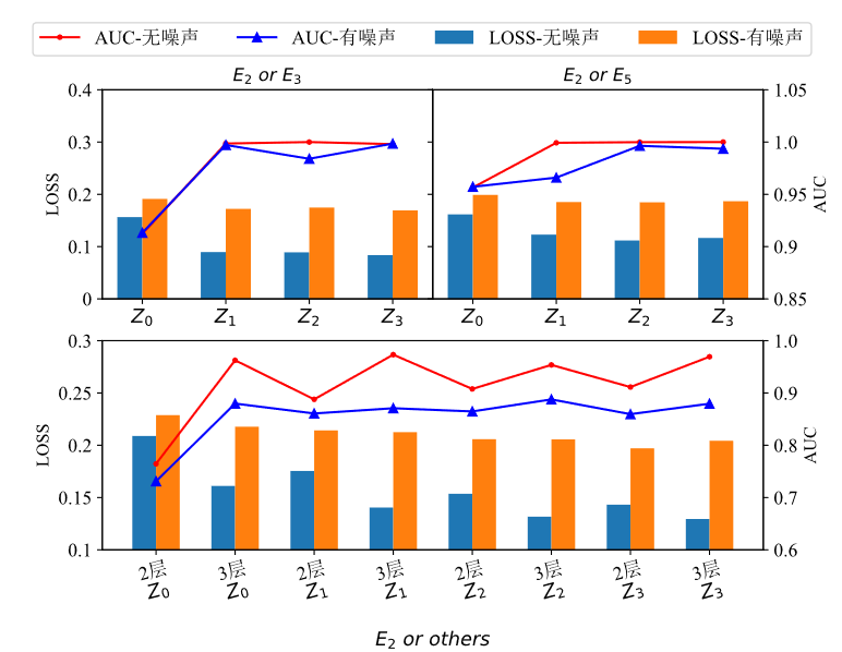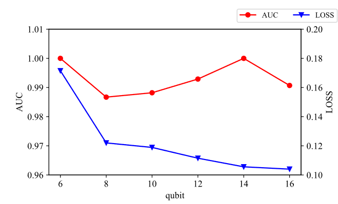 图5 在不同的参数化线路层数以及测量设置下的平均AUC和LOSS
