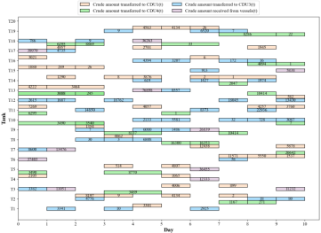 本研究提出了一种基于知识辅助的大规模原油调度与计划集成优化模型,该模型采用了一种结合数学规划(MP)和粒子群优化(PSO)的混合优化算法(MP/PSO)进行求解。长期计划旨在最小化运营和运输成本,同时最大化炼油厂利润;而短期调度则基于初步的长期计划,旨在最小化装置切换次数。在短期调度阶段,基于经验操作知识的启发式规则生成一个高性能的初始种群,以加速收敛。这一策略对于提升炼油厂的应急响应能力、确保稳定运行以及提高经济效益至关重要。实验结果表明,MP/PSO在本文大规模原油调度场景中的表现优于PSO和人工调度。