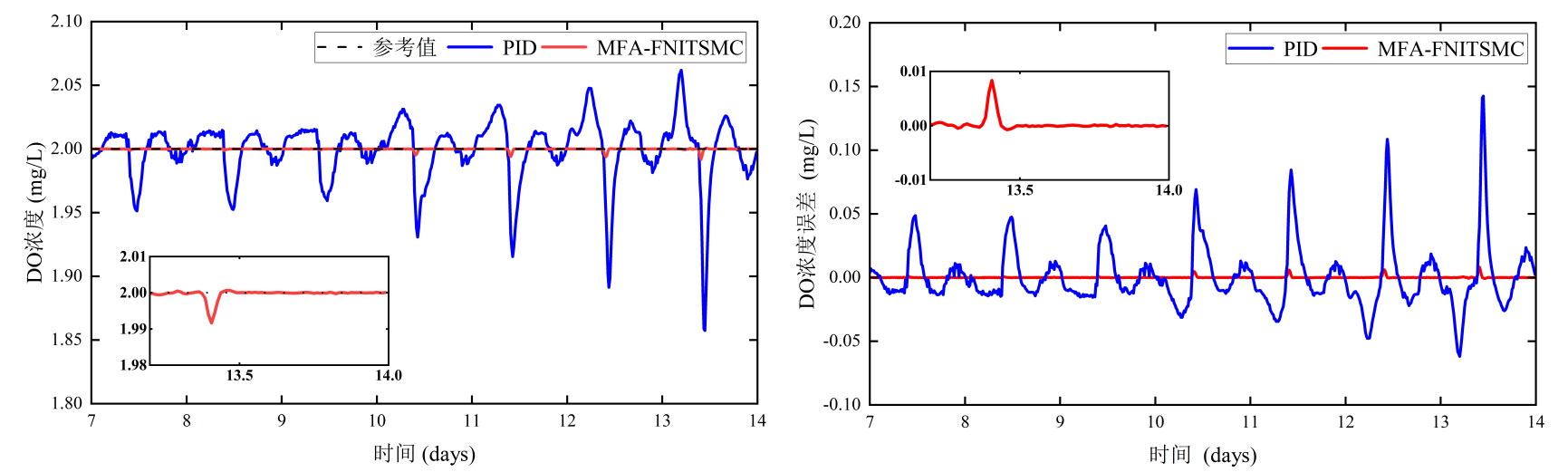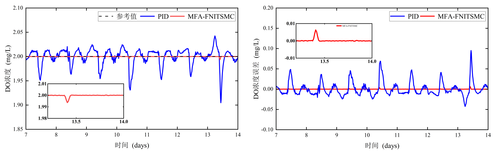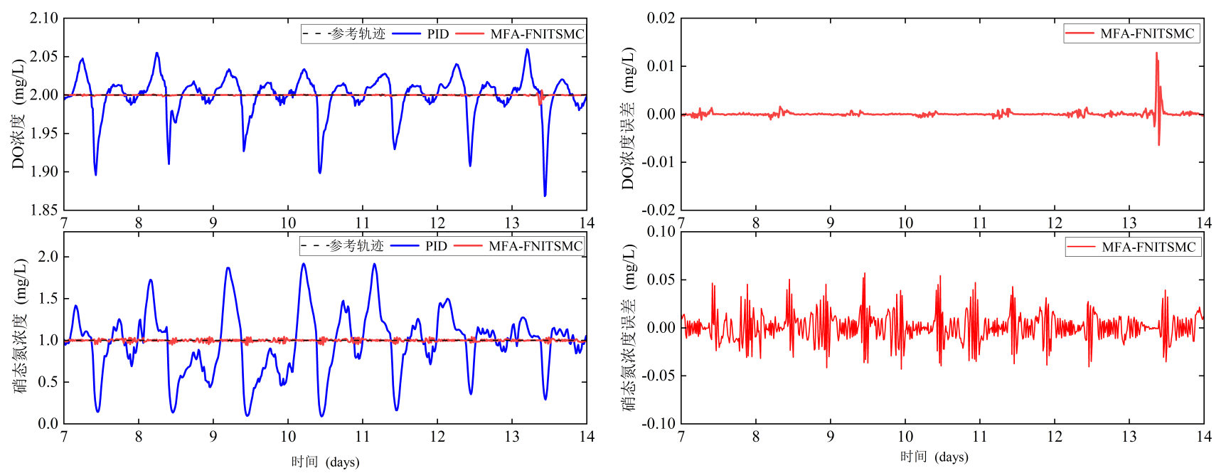 (3)基于国际基准仿真平台BSM1对所提出方法的控制效果进行了验证并与PID和MPC等方法的控制效果进行了比较。研究结果表明,本文提出的MFA-NFITSMC方法在污水处理过程的控制中具有更好的跟踪性能和更强的鲁棒性。