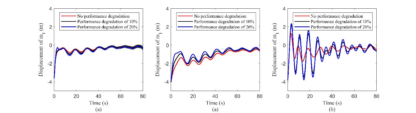 图3 不同程度参数不确定情况下质量块一RVC、DRHGPC与LQR控制效果对比