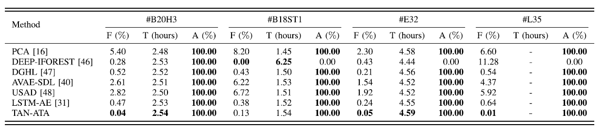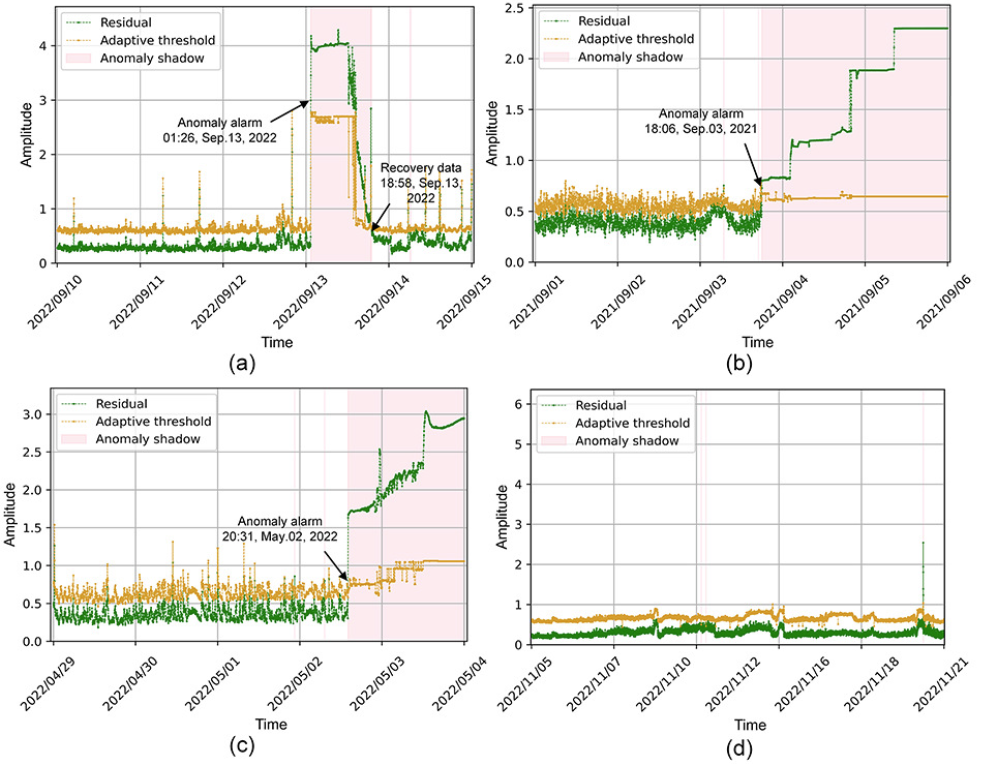此外,TAN-ATA在不同测试数据集上的异常检测结果如图3所示。自适应动态阈值可以很好地处理ESP正常运行过程中噪声引起的误报且不会引起报警的滞后。