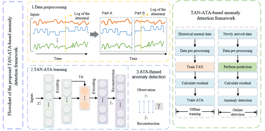 TAN-ATA方法的总体框架如图2所示,该方法包括三个阶段:数据预处理,TAN-ATA学习,以及基于ATA的异常检测。特别的,TA机制集成到时序模型体系结构中以创建TAN。此外,提出了一种自适应阈值策略ATA,用于ESP异常检测。在线测量阶段,将新样本输入TAN-ATA,实时获取当前异常情况。