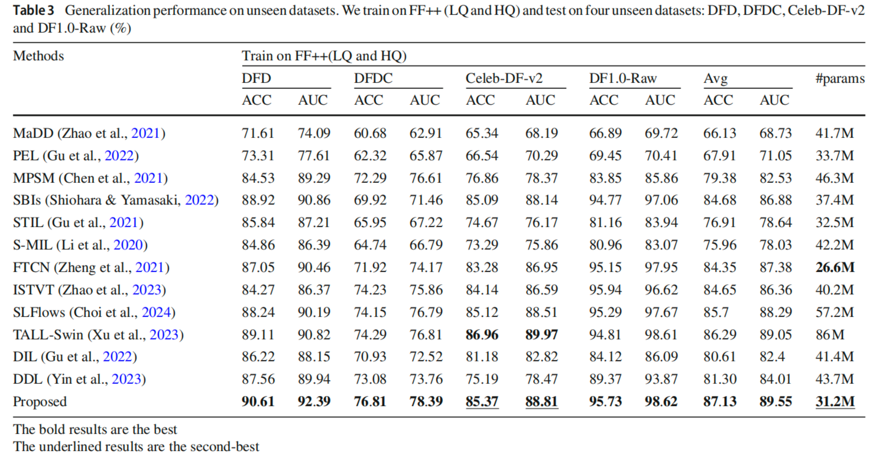 通过以上损失函数,域对齐损失可以直接消除特征分布中的域偏差,我们的框架被引导学习域不变的不一致性表示,从而进一步提高检测深度伪造视频的泛化能力。