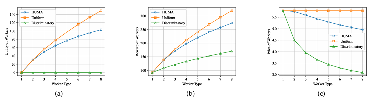 图5展示了在不同定价方案下,不同种类工人的效用、奖励以及数据收集的定价。