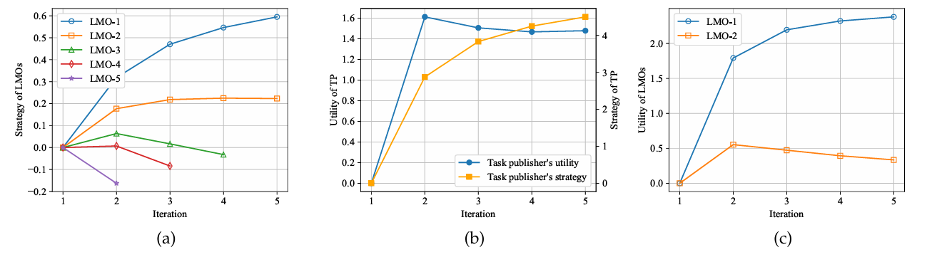 图3 上层博弈中迭代次数变化对性能的影响。(a) 本地模型拥有者的策略。(b) 任务发布者的效用和策略。(c) 本地模型拥有者的效用。