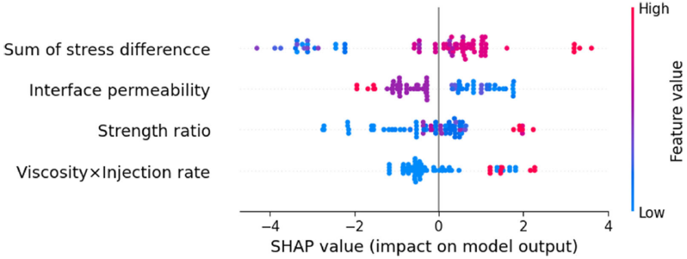 在XGBoost完成预测后,采用SHAP对预测结果进行解释。图4展示了训练集数据的SHAP值,其中Feature value表示相应特征的输入值,SHAP值为正的特征值有利于穿砾,而SHAP值为负的特征值有利于绕砾,可看出较高的界面渗透率和强度差会促进裂缝遇砾偏转,而较高的地应力差、粘度和排量会促进穿砾。