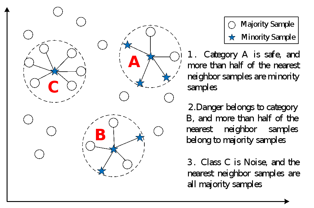 在 TPD 模型的扩散区域,数据分布未知,因此使用均匀分布生成虚拟样本点,如图 1中蓝色星形点所示。在观测区域,由于原始样本分布未知,因此使用边界线-SMOTE 算法生成虚拟样本,并在此间隙中不重叠。因此,在直接观测区域生成的虚拟样本可以填补离散样本观测点的信息空白,从而解决原始样本不平衡的问题。扩散区域的样本点也会被添加额外的信息,边界线-SMOTE 的原理如下图 2 所示。