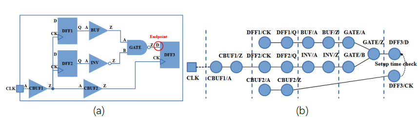 我们收集电路的统计数据,组织电路设计文件,其中包括描述电路结构和时序信息的各个重要部分。图2 (a)是一个简单的电路示例,SD-SSTA算法通过读取电路设计文件构建如图2 (b)所示的时序图。