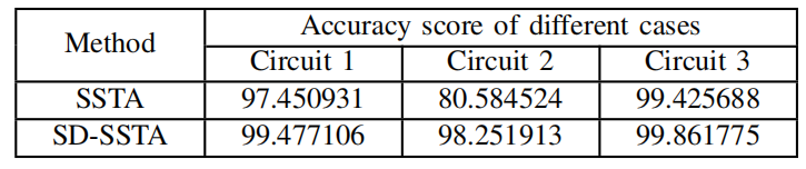 根据评分公式计算出相应的时序宽裕量准确度得分。表2比较了三种不同测试用例下SSTA和SD-SSTA算法计算的时间宽裕量准确性。从表1中可以看出,电路3的方差小,即工艺参数的变化范围很小,因此传统算法可以实现精确的计算。而电路2的方差大,传统方法无法解决,SD-SSTA算法的优越性从而体现出来。