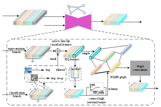本文提出了一种更加高效的对比学习方法,并结合特征之间的关系图,使得模型能够提取更加鲁棒的表示。对于表示学习任务,我们采用类原型来构建长尾场景下的高斯混合模型,以减少计算和内存上的开销。并且我们利用高质量的特征关系图建模特征之间的关系,使得提取的特征能够考虑到相似的语义特征。