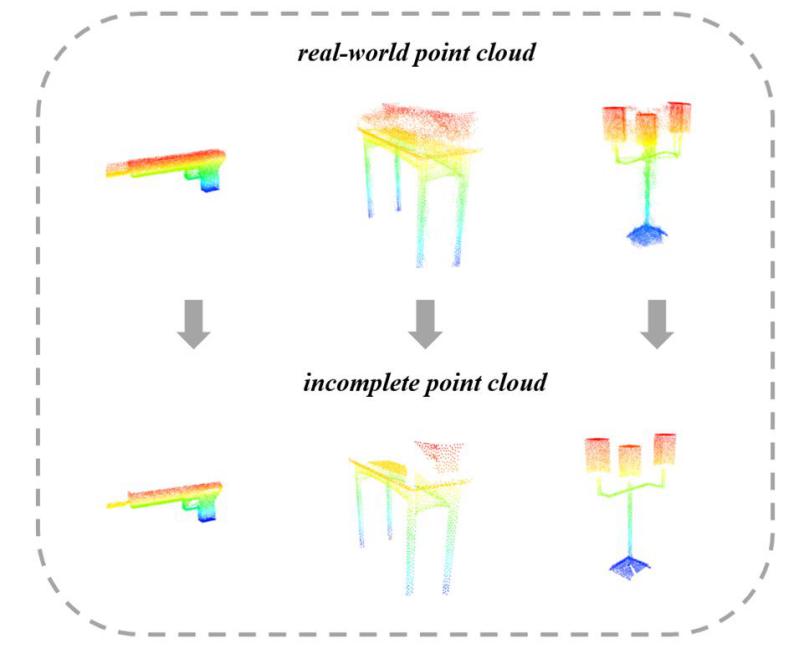 图1 真实世界对象(上图)与3D扫描仪捕获的不完整数据(下图)之间的比较
