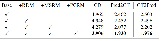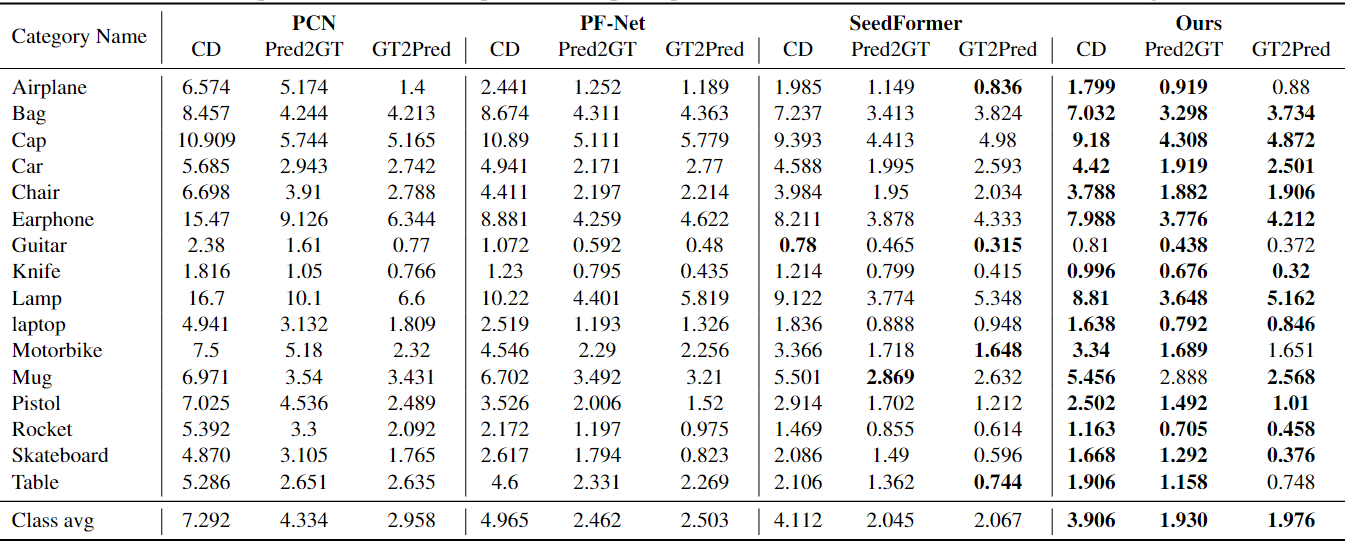 在 ShapeNet-part数据集上地表现如表1所示,我们的 RD-Net 在具有相同输入和裁剪大小的 ShapeNet-part(16) 数据集的大多数类别上实现了最低的 CD 误差。