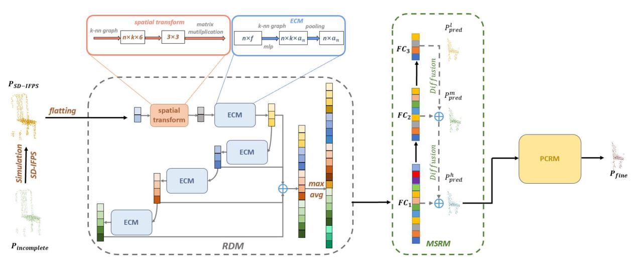 在本文中,我们提出了一种新颖的形状补全网络,即 RD-Net。该网络包含三个关键模块:区域动态模块(RDM)、多尺度重建模块(MSRM)和点云细化模块(PCRM)。我们引入RDM通过迭代EdgeConv增强了网络提取语义和几何信息的能力。我们将MSRM设计为插件可定制模块,通过结合不同分辨率的特征来处理具有相对复杂表面的几何图形。我们提出了PCRM自适应聚合局部邻域特征,通过学习相邻点的关系来有效地生成结构细节。整体框架图如图2所示。