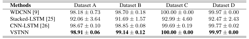 本文采用凯斯西储大学公共轴承数据集来验证所提出的VSTNN在轴承故障诊断中的有效性和优越性。以12 kHz的采样率采集电机驱动端在四种不同工况下的振动信号。四种不同方法在四种不同工况数据集下的平均诊断准确率如表1所示。很明显,所提出的VSTNN在诊断准确性方面在统计上优于其他方法,证明了其优越性。此外,可以观察到,与之前的方法相比,所提出的VSTNN获得了最小的方差,这表明了它的稳定性。