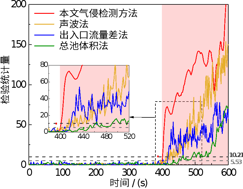 为验证本文气侵早期检测方法应用于实际工况的有效性,选用声波法、出入口流量差法和总池体积法进行对比实验。