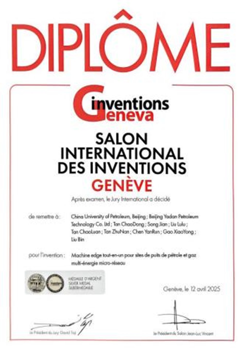 4月9日至4月13日,第50届“日内瓦国际发明展”在瑞士日内瓦举行,展示了近40个国家和地区的1000多项发明成果。中石大人工智能学院檀朝东、高小永、刘斌团队研发的"潜油电泵举升井实时诊断预警系统"和"多能微网采油气井场边缘一体机"参加现场展示,凭借其卓越的创新性和显著的应用价值,荣获2项银奖。