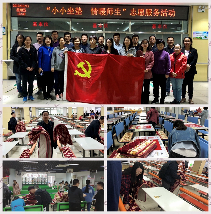 根据学校 “不忘初心,牢记使命”主题教育活动的工作安排和相关要求,10月11日下午,信息学院党委组织全体党员在我校学生食堂开展“小小坐垫,情暖师生”志愿服务活动,150余名师生党员参加了此次活动。