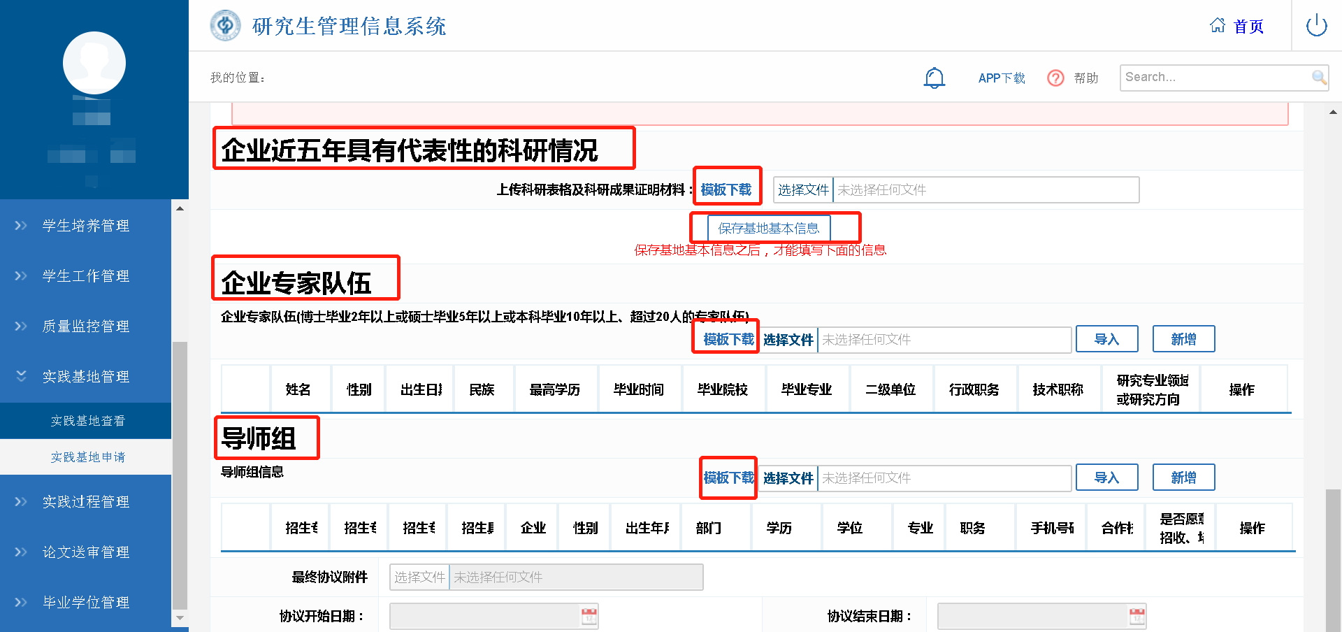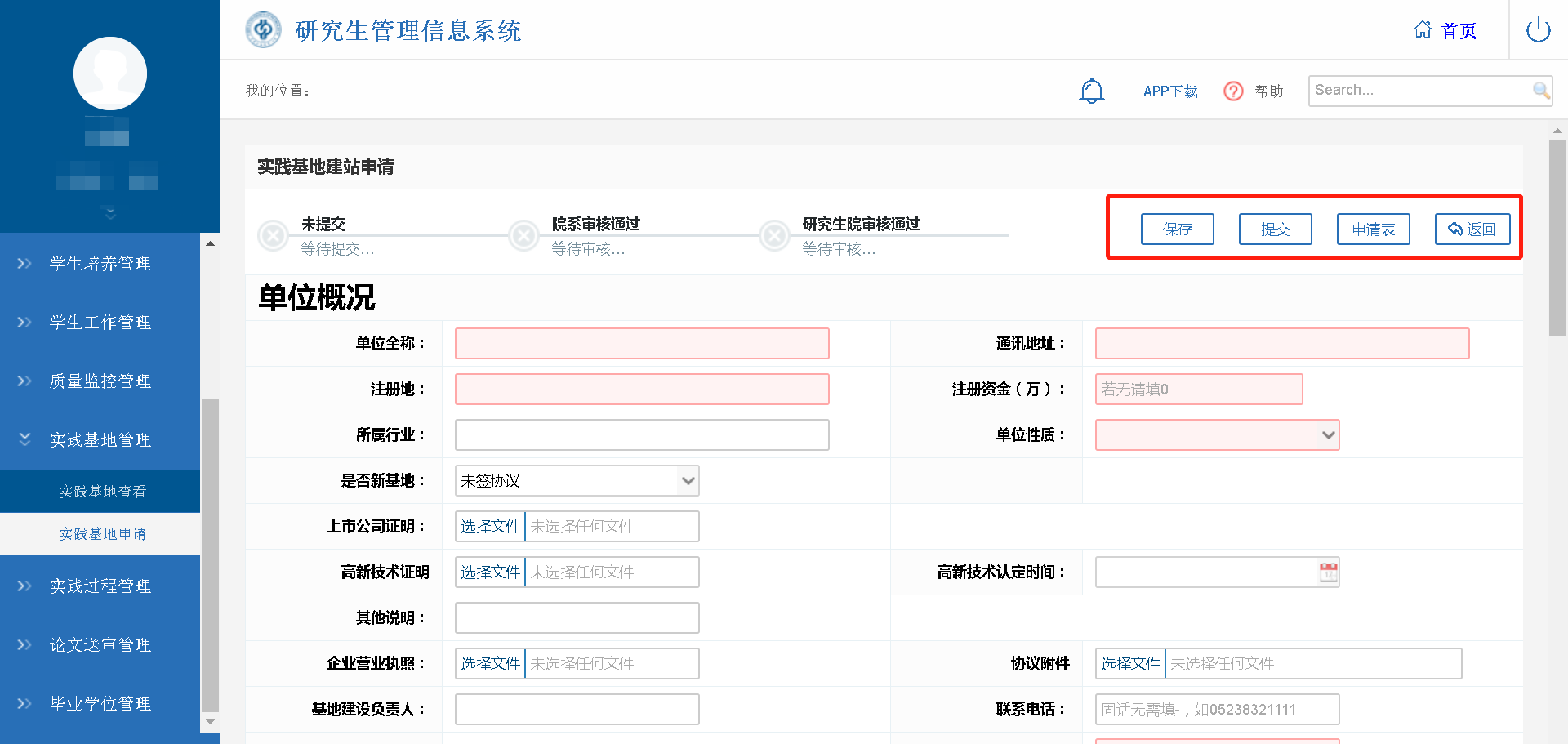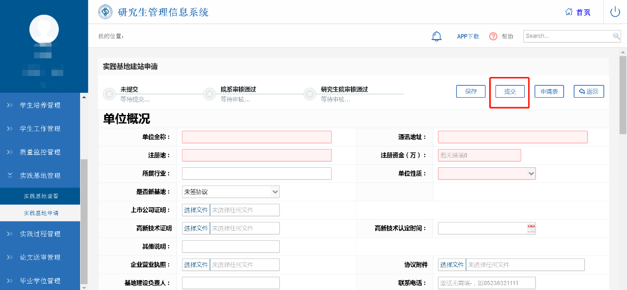 教师登录研究生管理信息系统,选择实践基地管理,实践基地申请,点击新增。
